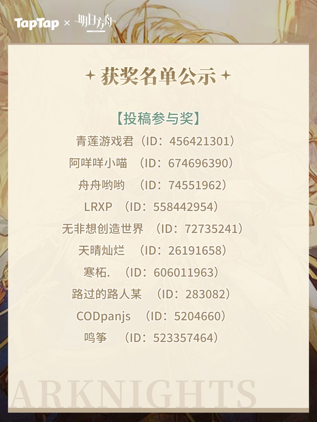 活动期间,投稿有效投稿作品≥2,综合考虑质量和数据维度,选出TOP1-5的优秀作者获得【123罗德岛 礼物盒系列盒蛋】一份