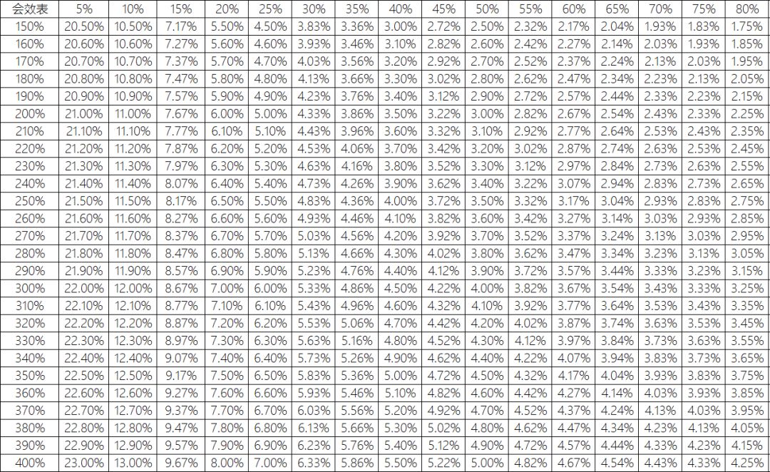 特定会心会效下,每1%增幅所需会心/会效数值速查表