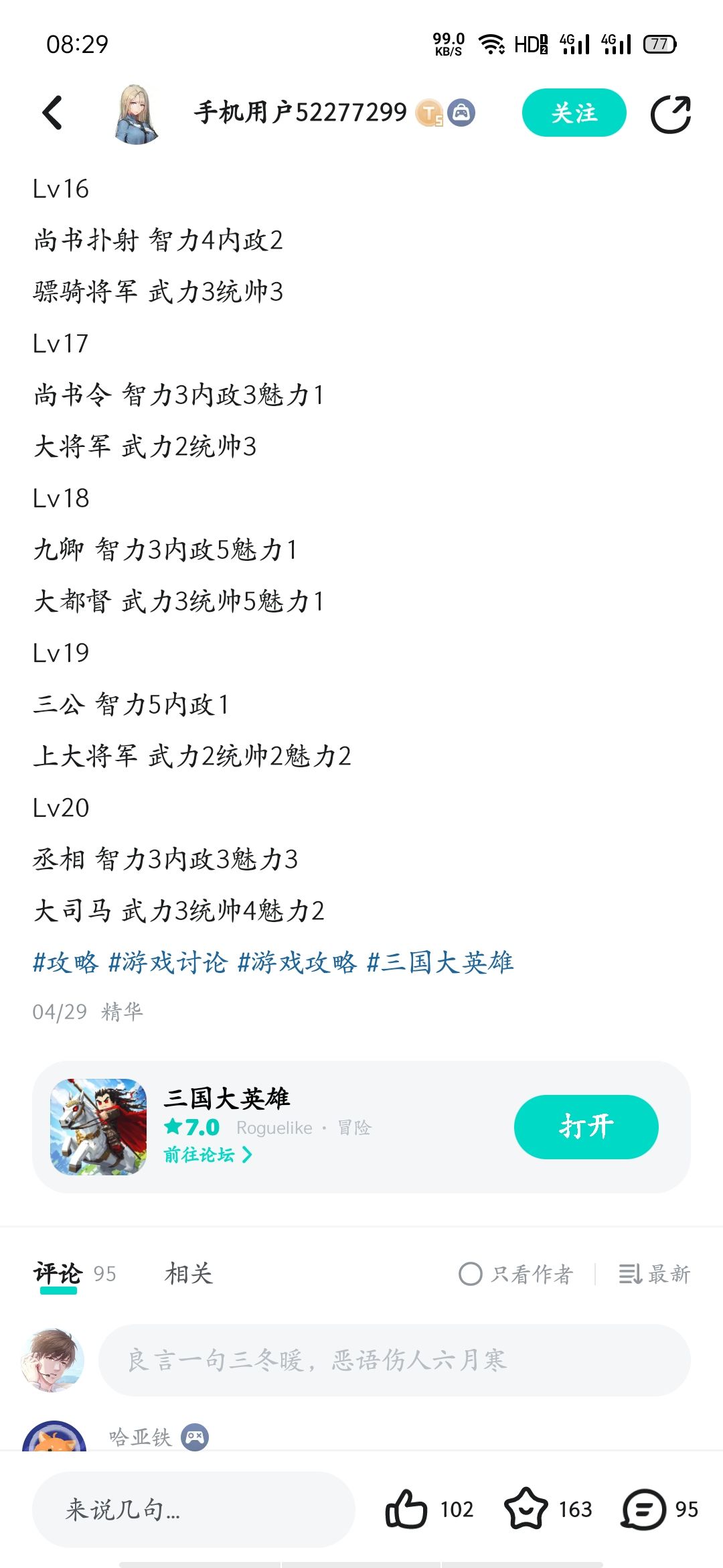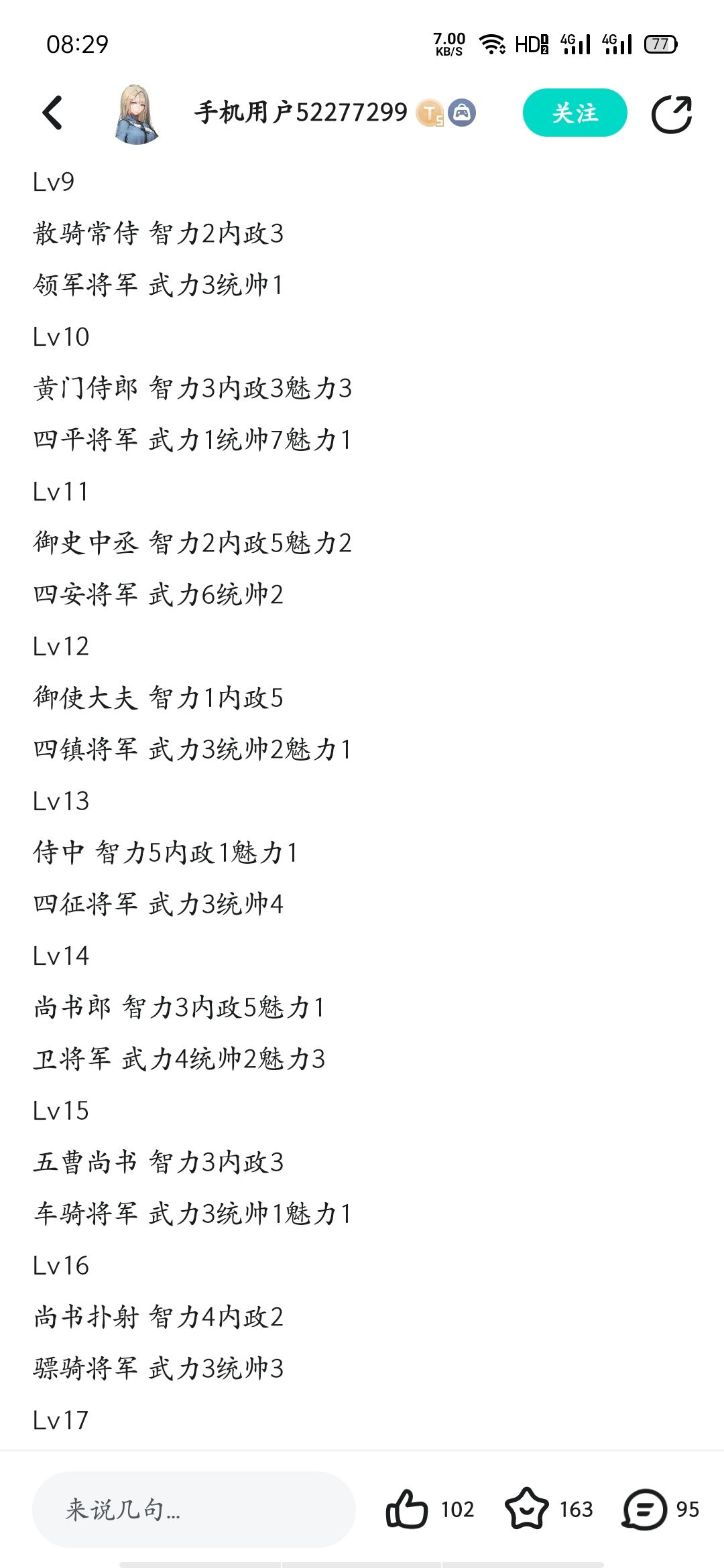 这样选择利益最大化,每五级一个阶段,第一阶段文文武文武固定最大化,城池建筑点了的话第一阶段武力30-40够修炼4级技能。剩下每个阶段前三级文文武是最大化,其他根据你关卡要求属性具体调整。