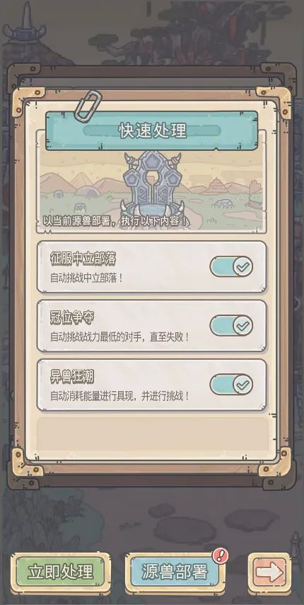 -快速处理时,冠位争夺、中立部落玩法将一键挑战至失败,异兽狂潮玩法将消耗所有石碑能量进行具现,并自动挑战