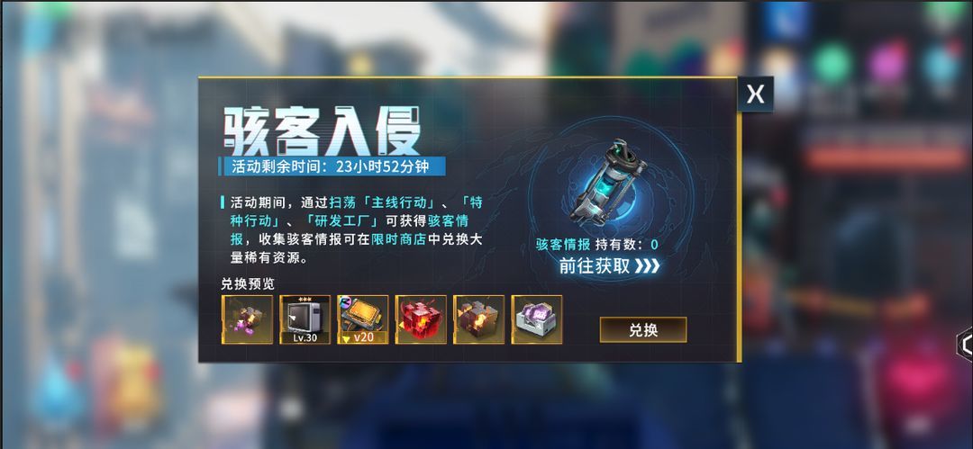 活动简介:玩家在活动期间,通过扫荡「主线行动」、「特种行动」、「研发工厂」可获得骇客情报,收集骇客情报可在限时商店中兑换大量稀有资源。