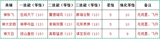 一技能提高自己的速度并普攻4次;二技能提高命中和普攻伤害;三技能我选择群雄合聚是因为看中的它的增加全伤害和暴击;就喜欢暴力的一批。以我目前技能等级下张飞满状态攻击加成138%;暴击加成105%。这时有人会问了;不是打地需要奶妈吗?这阵容为啥没有啊?因为不!需!要!;我拿这个阵容打了10次20级地都是在一回合之内解决战斗的。。嘻嘻 要的就是这效果;下面请看图: