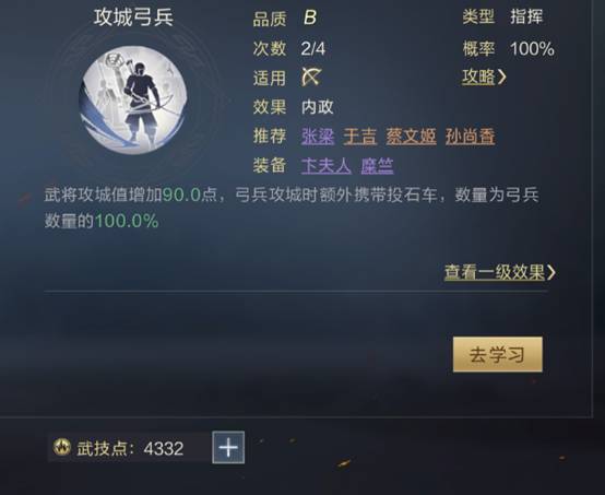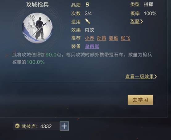 带上攻城技能后:一级攻城技能武将攻城值为85