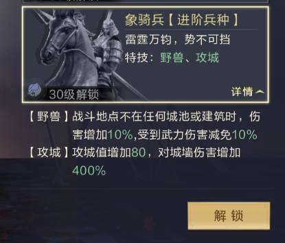在武将达到三十级时进行兵种进阶,进阶成象骑兵