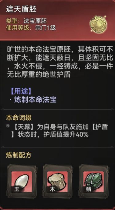 比如,用截图中的【遮天盾胚】来炼制本命法宝,我们就会获得一个具有【天幕】词条的新法宝。