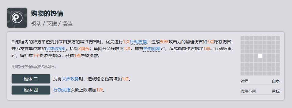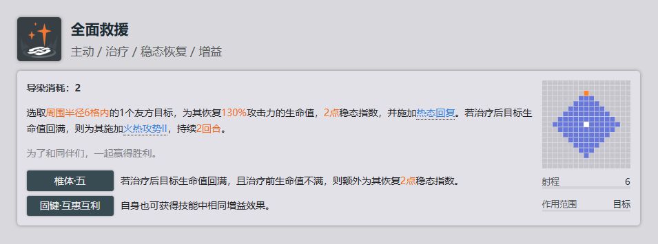 治疗类支援角色都会有的支援射击,4椎之后可以进行两次的支援射击,性价比极高,该被动大幅度的提高了科谢尼娅的破稳能力,以及在支援射击的同时还能给队友挂上高额的增伤,可以说是非常强大了。除此之外该被动提供了科谢尼娅的导染恢复,我们可以看到如果你全面救援治疗完之后队友满血那么你就能保持两个燃烧类增益,而全面救援只需要2点导染,所以说在治疗量足够的情况下,科谢尼娅是可以做到导染不断一直治疗队友的,同时还能利用热态恢复治疗自身,在很多情况下特别的好用。