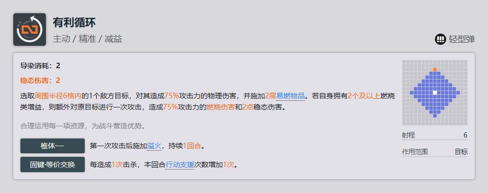 一般开场使用,造成一定的破稳能力后顺带获得两个燃烧类增益可以恢复导染也可以紧接着使用有利循环等进行高效破稳,同时如果配合6椎的效果甚至还能打出一定的输出,只不过一般用于开场释放,中后期一般不会缺导染,所以不需要该技能的释放。