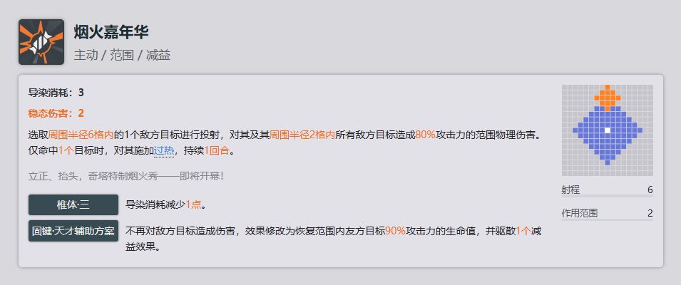 三椎之后才好用,不过由于现在新手就可以直接领到满椎奇塔,所以还是着重说明三椎之后的内容,三椎之后技能的导染消耗减少成了2点,可以经常使用该技能,是一个倍率还行同时范围非常大的一个aoe技能,配合其他角色的aoe在前期可以做到快速消灭一群敌人的作用,且如果只命中一个敌人的话还能施加游戏中比较高贵的一个减益buff过热,一个类似于麻痹的指令禁止的燃烧类减益。在装备固键·天才辅助方案之后,该技能可以变成治疗技能,从给地方使用变成给友方使用,同时还可以驱散,是一个范围很大的群奶技能,效果时很明显的,同时这也是奇塔很少的主动治疗技能,加上现在aoe不强势所以把该技能变成治疗技能也是一个不错选择。
