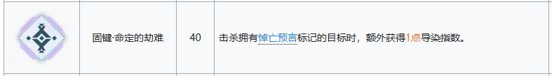 一个恢复导染的手段,一般如果你能处理好支援射击的频率的话导染倒是不会太缺,如果你由于伤害太高而触发不了纳美西斯支援射击所以没有导染的话一般来说你也不需要这点导染指数,但是也是一个比较不错的固键,实战中还是偶尔会用的上的,在没有其他固键需求的情况下可以带上。