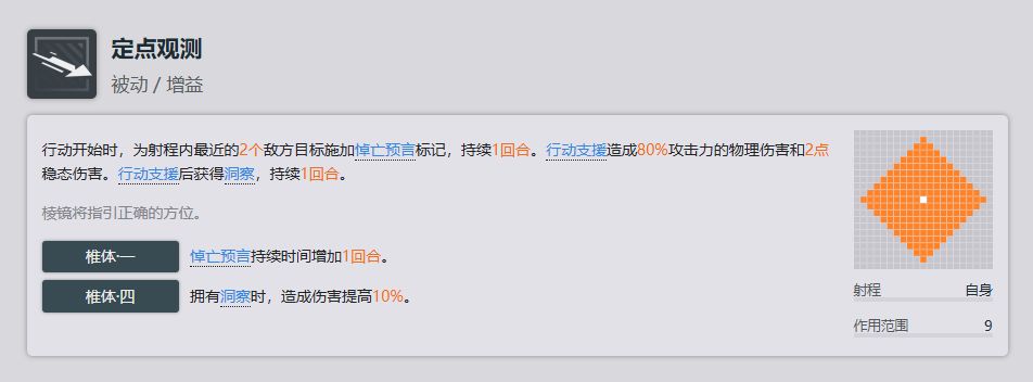 生存类固键,在部分情况下有点小作用,具体实战情况关系不大,因为毕竟是作为一个狙击输出,一般在阵容的最后方,不太容易或者会避免被范围伤害攻击到。
