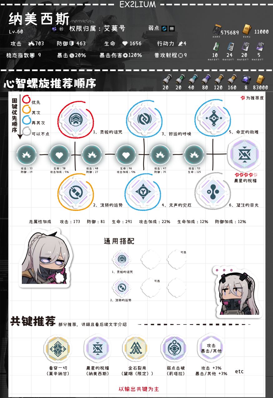 推图中可能比较好用的固键,通过增加狙击的射程来弥补狙击腿短的却缺点,不过由于一般纳美西斯不怎么用于推图,所以该固键量力而点。