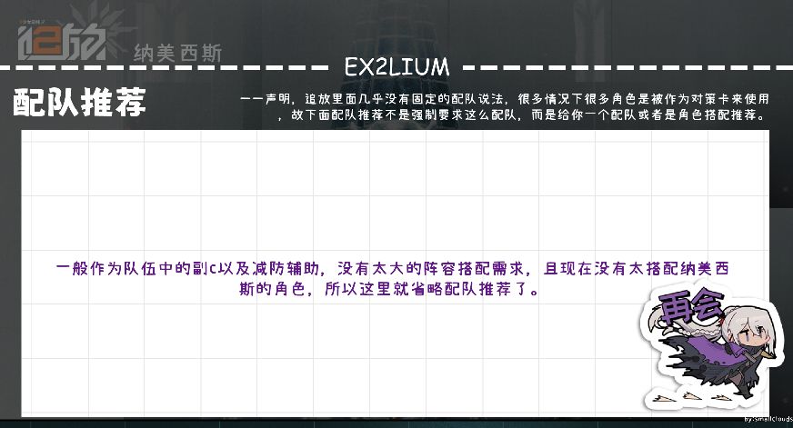 一般作为队伍中的副c以及减防辅助,没有太大的阵容搭配需求,且现在没有太搭配纳美西斯的角色,所以这里就省略配队推荐了。