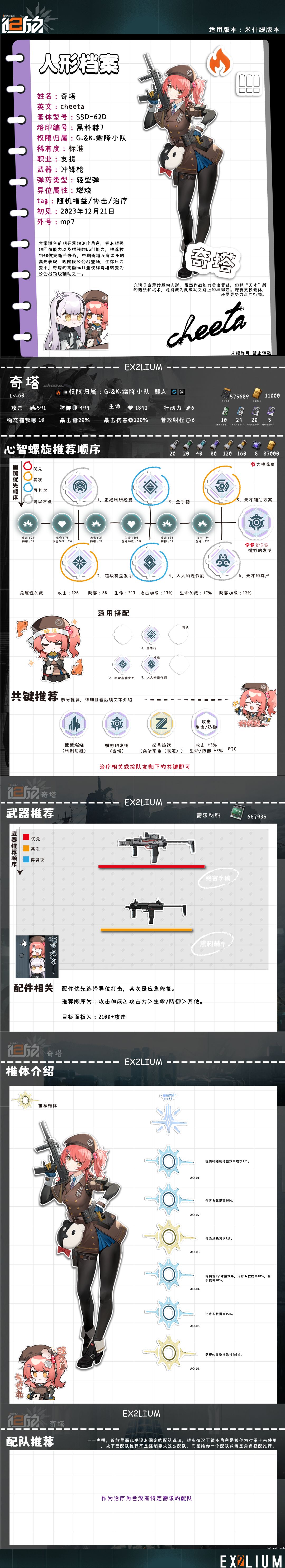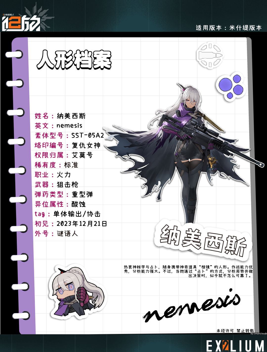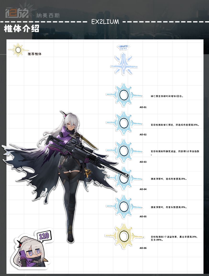 实战中其实纳美西斯就是一个比较通用的火力狙击定位,通过支援射击去弥补一下队友的伤害,使得更容易的造成击杀,或者通过高点以及什么其他手段利用手长的优势去击杀比较靠后的有威胁的敌人。在boss战中则作为一个减防手以及副c的定位,尽量保证先开自己技能来给队友提供减防,但是这需要根据具体情况来看。(部分图片引用gf2wiki)