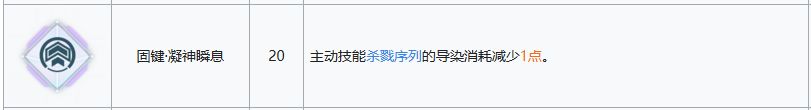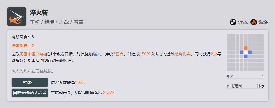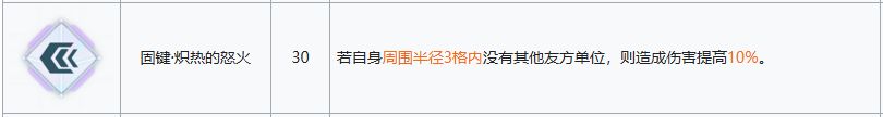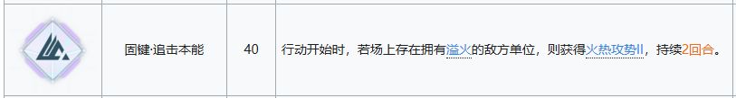 很不错的一个被动,不过需要根据具体情况,而行动结束时的溢火,在非常前期推图时可以用来补刀,同时可以搭配一下夏克里打出不错的配合,而且是一个廉价的能够给敌人挂异位减益的技能。