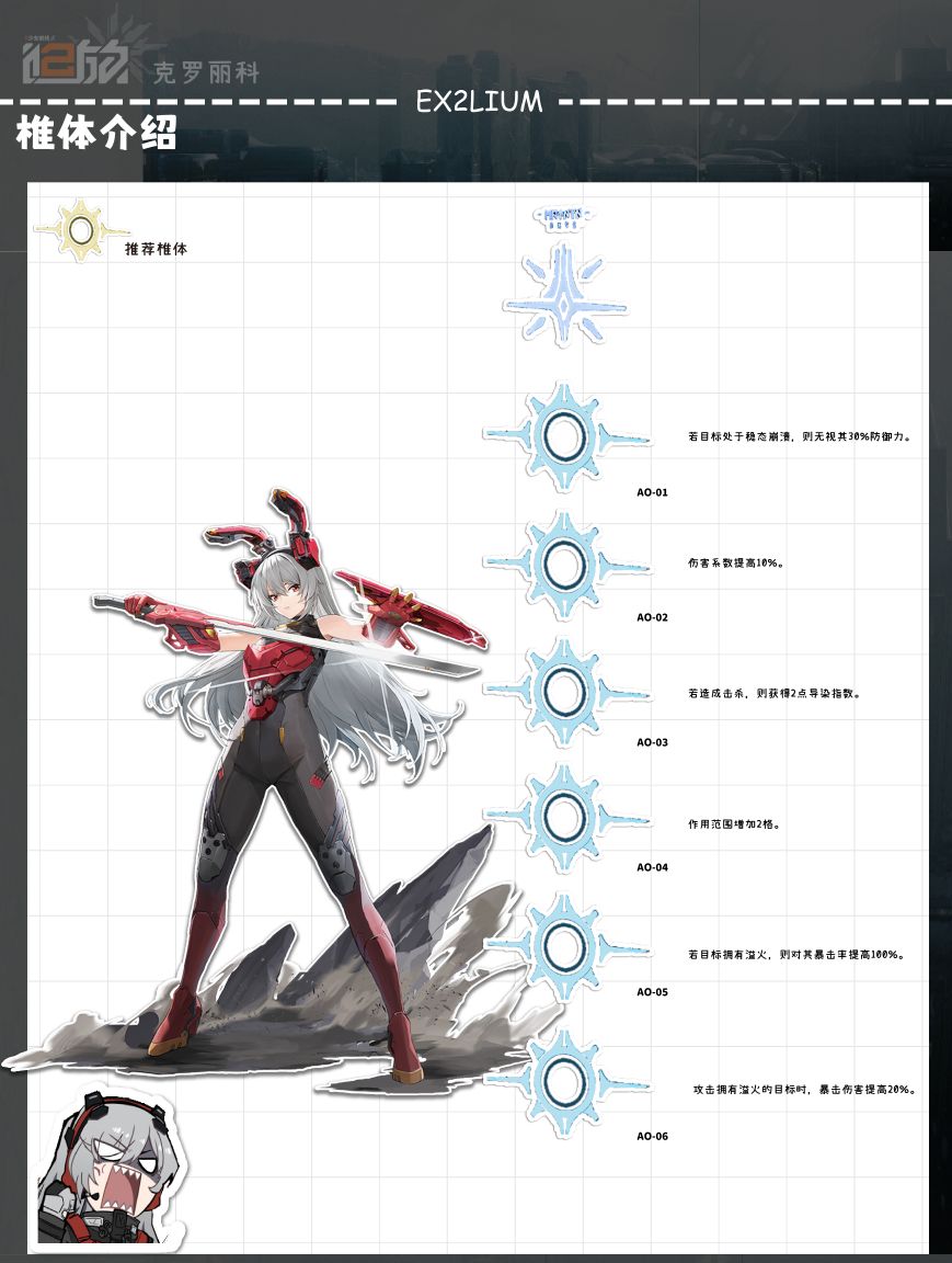 克罗丽科拥有很不错的机动力,同时其制胜技能够应用到很多逃课场景,现阶段的武器被动的主动攻击每造成3次击杀获得一次行动追加拉高了克罗丽科的上限,但是由于本身是四星伤害不高加上自保能力弱的特点导致克罗丽科上场的机会比较少。不过前期用来逃课还是配合夏克里装上固键后的临机支援还是挺好用的。