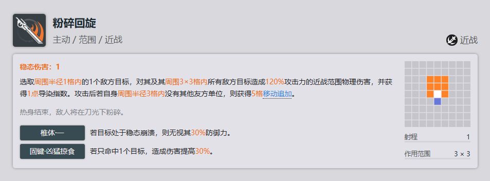 一个选定地方单位的范围aoe伤害,算是克罗丽科的核心技能,如果能造成多个击杀配合上刀的被动再动效果,可以让克罗丽科发挥出非常强大的作用,比如在金币本中,但是这里要注意,使用克罗丽科技能时,如果对面在掩体后,能无视稳态减伤,但是无视不了掩体减伤。而这个技能还有一点就是需要半径三格内没有友方单位,所以使用时需要注意一下友方的位置,否则容易出现冲到前面然后回不来的情况。