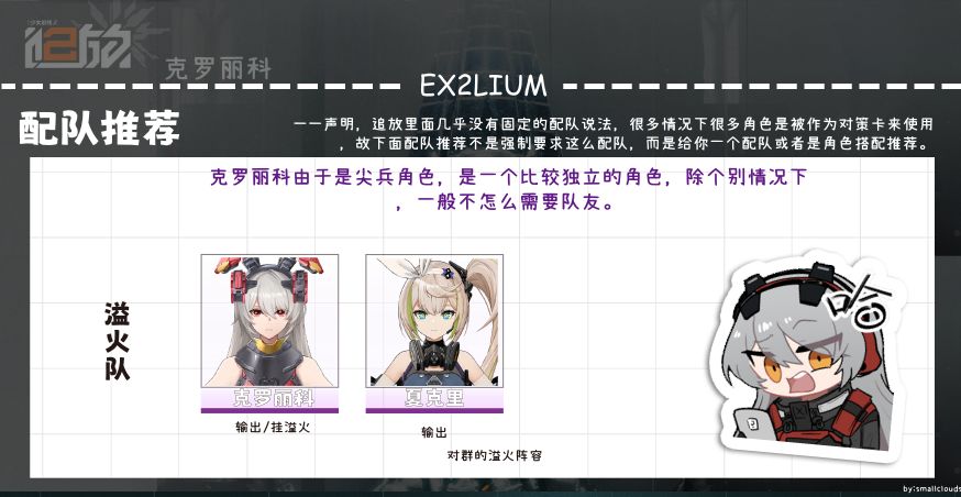 克罗丽科由于是尖兵角色,是一个比较独立的角色,除个别情况下,一般不怎么需要队友。