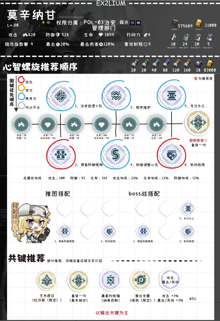 其他共键推荐不过多一一描述:所有暴击率+3%攻击力+3%的共键(高椎或带上专武时,否则使用攻击力+3%的共键就行);暖场烟花(夏克里)(莫辛纳甘自身buff能力也不错也很适合);前辈常谈(纳甘)(朴实无华通用加伤共键);弱点击破(莉塔拉)(不错的加伤共键需配合琼玖);暴力美学(克罗丽科)(不错的输出共键,需搭配燃烧系奶妈),直击心灵(维普蕾)(boss战使用)。