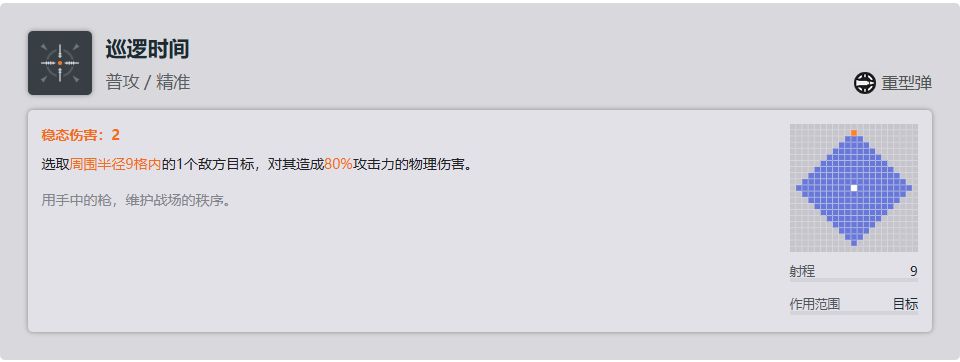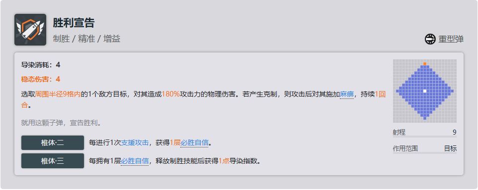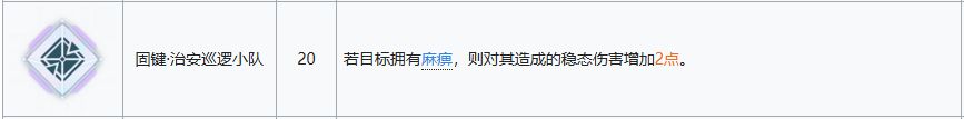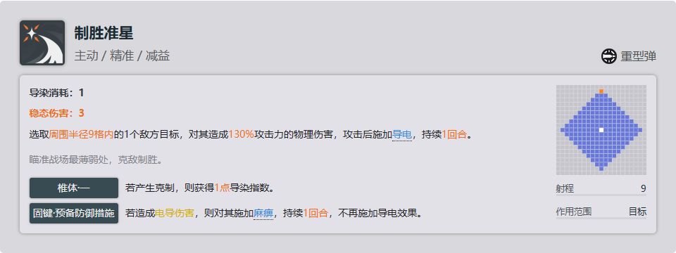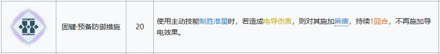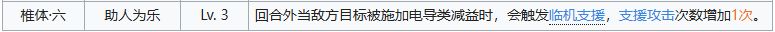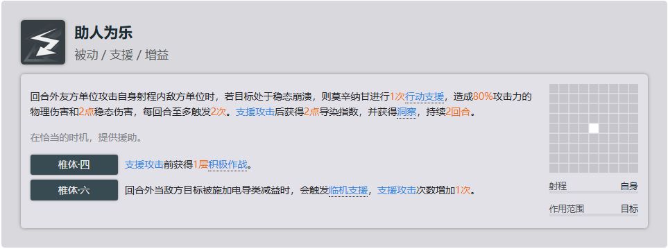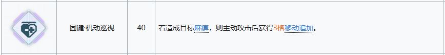 关键技能,尽管也对boss不生效吧,但是对于普通单位甚至是精英单位时都很有作用,可以在低练度的时候缓解压力,且配合6-03机动巡视还能触发移动追加性价比很高,缺点就是如果你造成了击杀则不会触发移动追加,但是如果你开了使用积极心态后获得电击buff的话是可以触发移动追加的。
