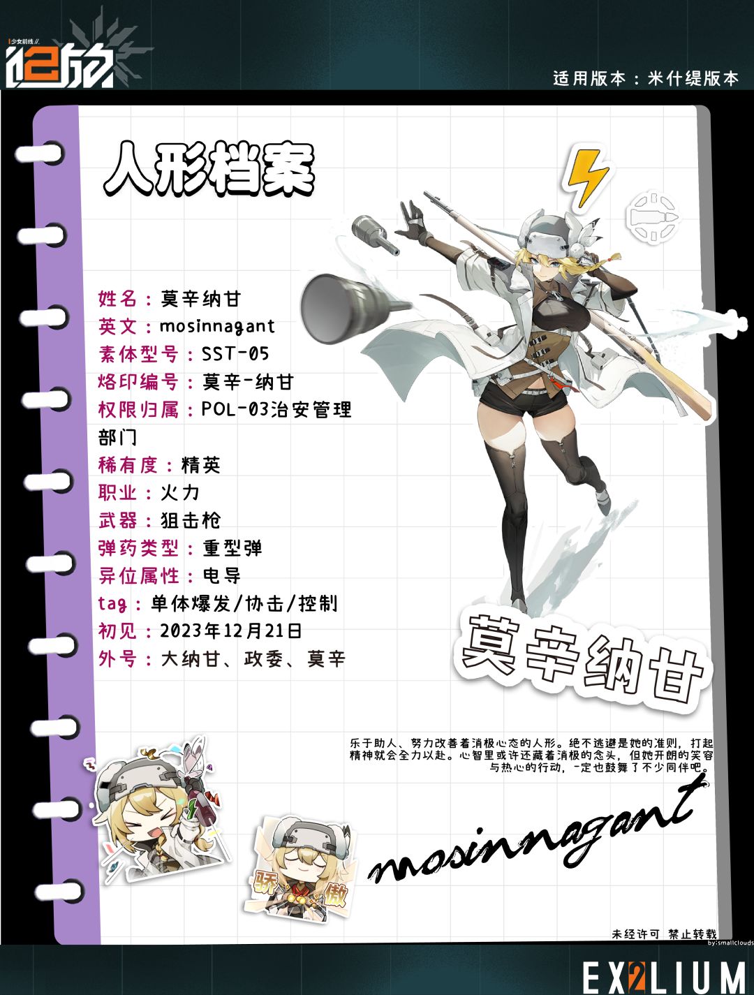 hello大家好啊,这里给大家带来常驻角色【莫辛纳甘】的一图流加全方面解析攻略。ヾ(@^▽^@)ノ