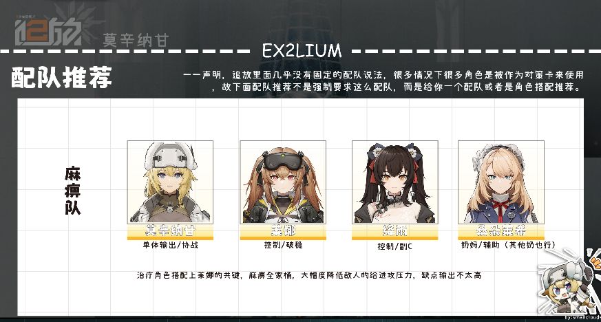 ——再次声明,追放里面几乎没有固定的配队说法,很多情况下很多角色是被作为对策卡来使用,故下面配队推荐不是强制要求这么配队,而是给你一个配队或者是角色搭配推荐。