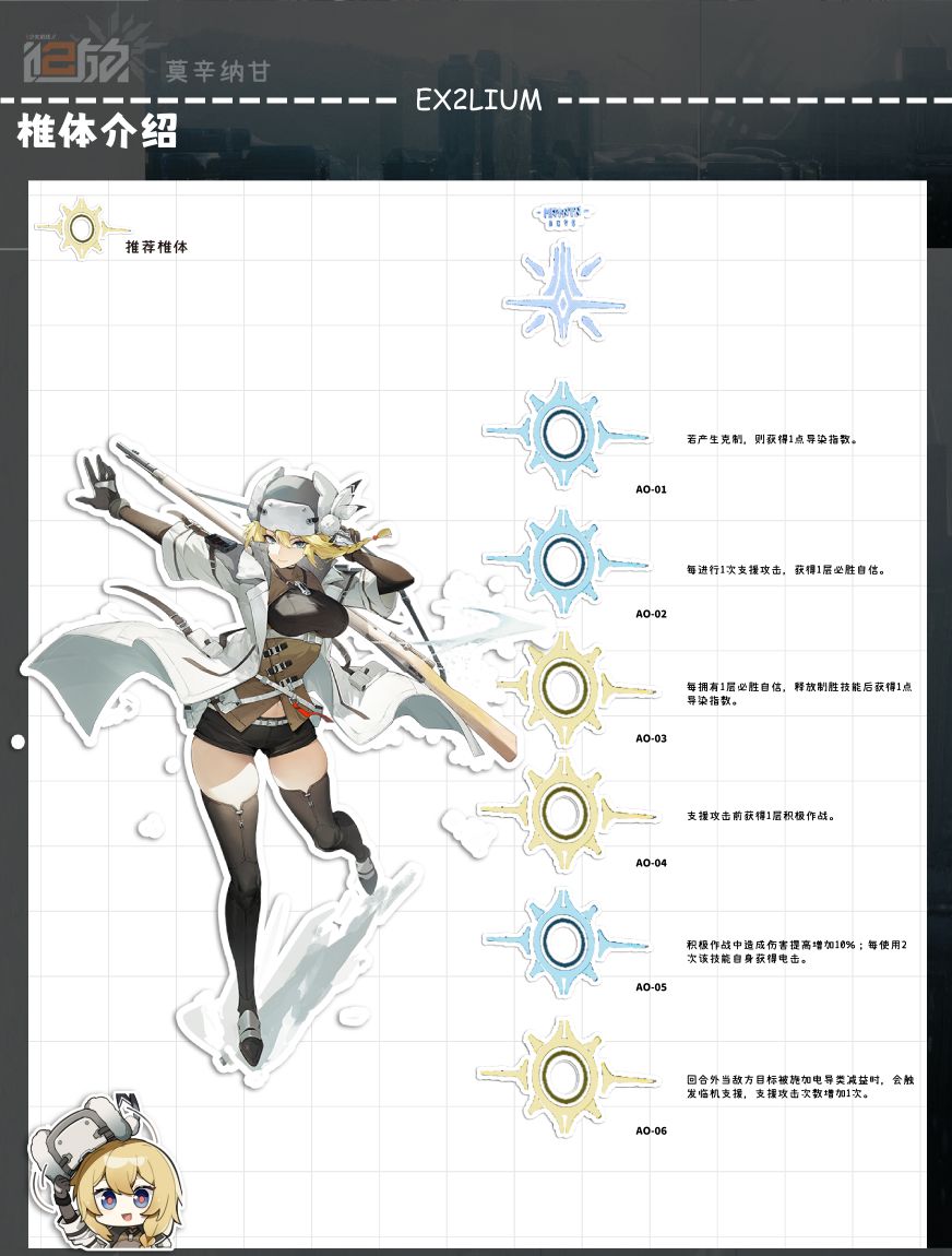 核心固键,虽然不是伤害固键,但是由于作为狙击枪人形,无法避免的就是移动力太低的问题,所以3格的移动追加对于短腿角色来说性价比很高,可以配合2-03 预备防御措施或者制胜技或者其他角色来获得三格的行动追加,在机动性上有很显著的提升。故推荐度高。