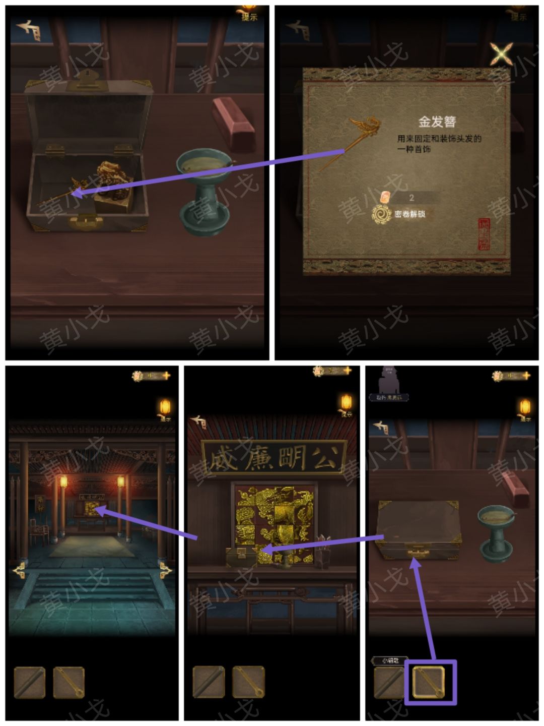 ⏩️点击桌子上的盒子,用【小钥匙】打开,获得【金发簪】
