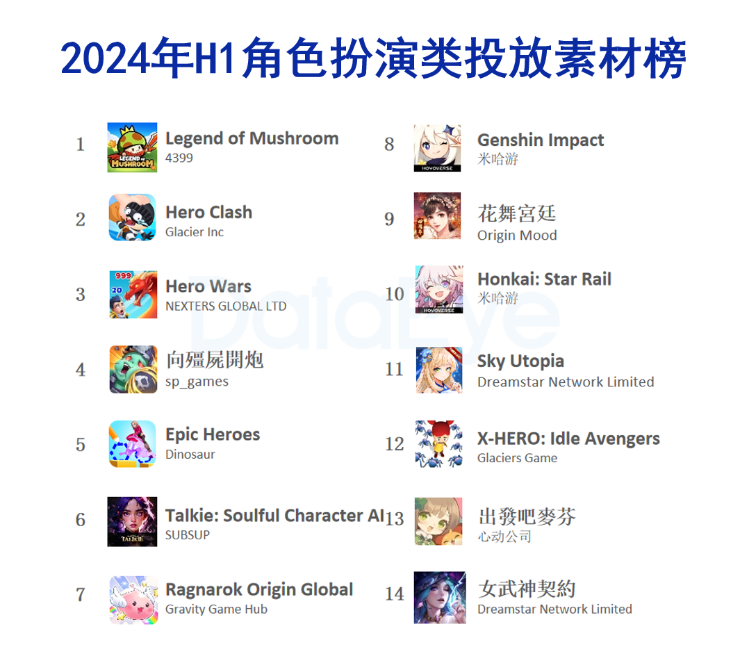 无独有偶,位列百强榜第4的广州4399今年也凭借买量攻势强势突围。根据DataEye数据显示,2024上半年4399旗下《菇勇者传说》成为同品类的买量冠军(出海领域),位列海外角色扮演类投放素材榜第1,以及海外手游素材投放总榜第3。