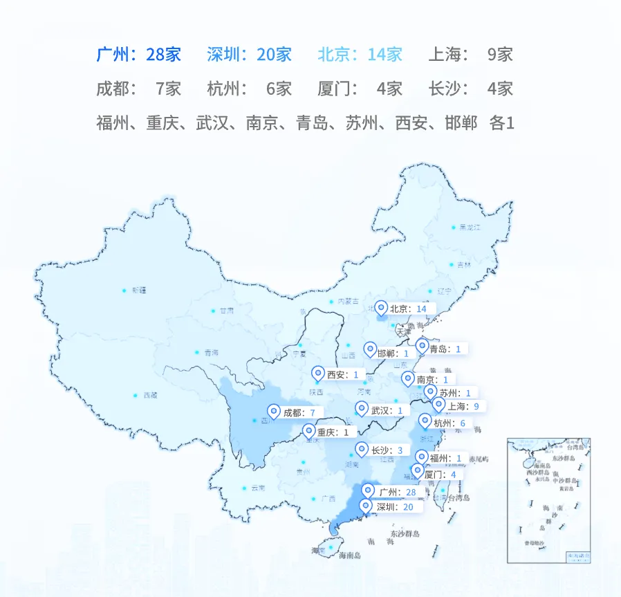 聚焦到小游戏百强榜本身,虽然上百家厂商的榜单信息一时间有些难以消化,但如果从百强企业的地区分布入手,原本错综复杂的局势也能慢慢理出些眉目。