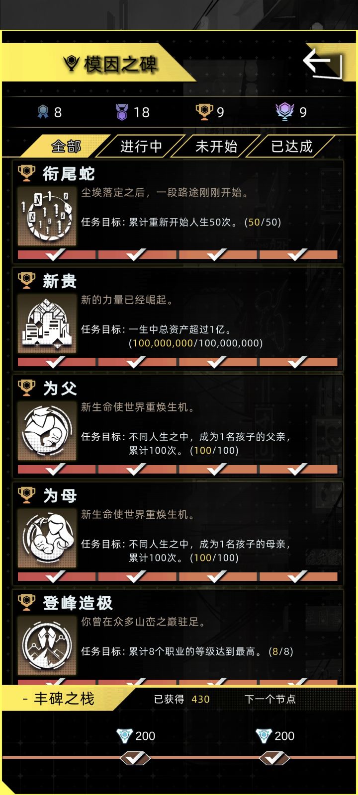 加入了家族这个版本之后 在「人际」-「家人」-「x氏家族」-「家族传统」-「天赋」这一脉最下面「基因优化」 可以减缓家族衰老速度 最大降低25% 以及第一项「运动习惯」可以让体能获取提升25% 这两个点了之后即使不带天赋「天选之子」也能轻轻松松活到110岁
