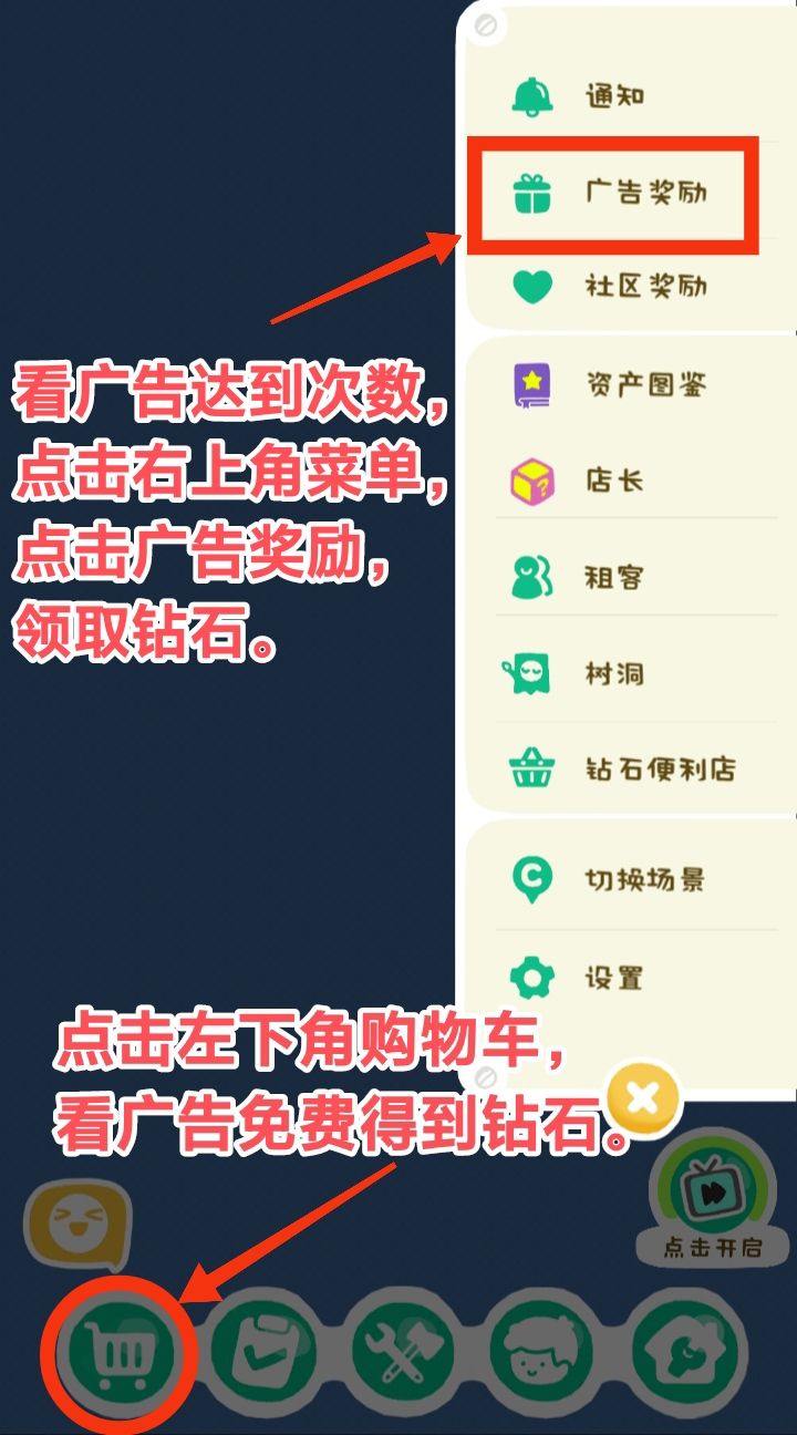 左下角点击购物车🛒进入看广告,每日可领取钻石💎。