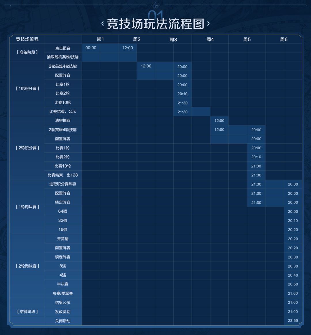 第1轮淘汰赛开始前,即64强比赛公示期间。开拓者可以选取并复制,本期活动所有轮次积分赛中1轮活动仓库的所有英雄/技能和阵容参与淘汰赛,并可以进行阵容配置和更换支援英雄/技能。