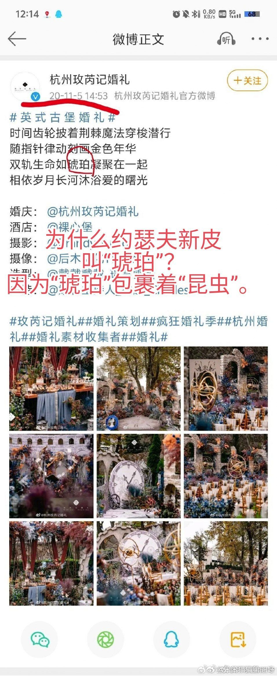 经过:网友在某书发现2022年10.7号,某婚庆公司发布了以上二位的婚礼现场布置,并发现其中一些和昆虫新皮元素极为相似,该帖引起风波后被迅速删除,但是网友们神通广大,作出了如下推理。