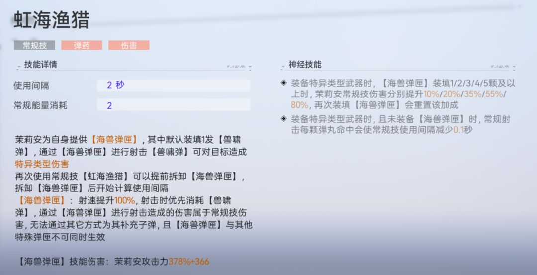 核心输出来源,主要伤害为特殊弹匣带来的技能伤害。单独使用常规技只能装填1发海兽弹药,效果不算好,吃不满加成。而在有特殊弹匣时使用常规技会直接清空,输出时不要误触。而在满弹匣时可以吃满左边的加成,资源不多可以先只点左边。可以说这个技能的使用完全依赖支援技,因此请看支援技。