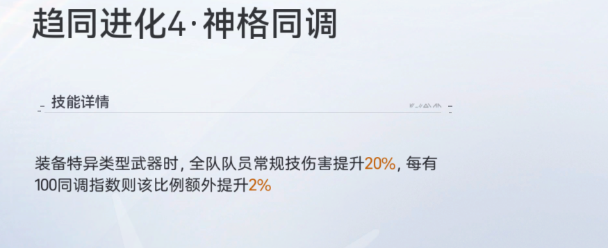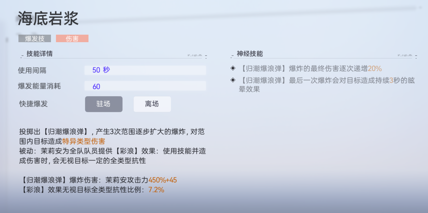 投掷奇妙形状的的手雷造成伤害。耗能60不算低,而且她的技能加成主要是常规技,大招主动部分的重要性就相对比较低。新手缺资源可以先不点神经技能。主要价值是被动给全队提供的技伤无视抗性,是非常实用的伤害乘区。