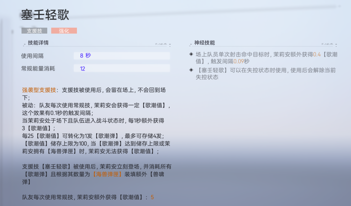 茉莉安幽潮存在队伍中时,可以看到这个槽,显示的是她的充能进度,4层充满。充能的主要方式就是连续使用常规技,因此需要配合高频率使用常规技的队友如薇蒂娅-龙舌兰和凯茜娅-朝翼。神经技能可以增加一些平射回复的能量,不过不是最主要的来源。充满后支援技的图标会高亮提示你尽快使用,使用后幽潮会直接进场,把充满的子弹变成特殊弹匣,算上常规技本身默认装填的1发,合计为5发高伤子弹,这5发算同1次常规技。使用思路就是打满能量后,用支援技上场迅速打完5发子弹,再切回主C。除此之外,神经技能还提供了给前场角色解控的作用,这也是非常稀有的效果。