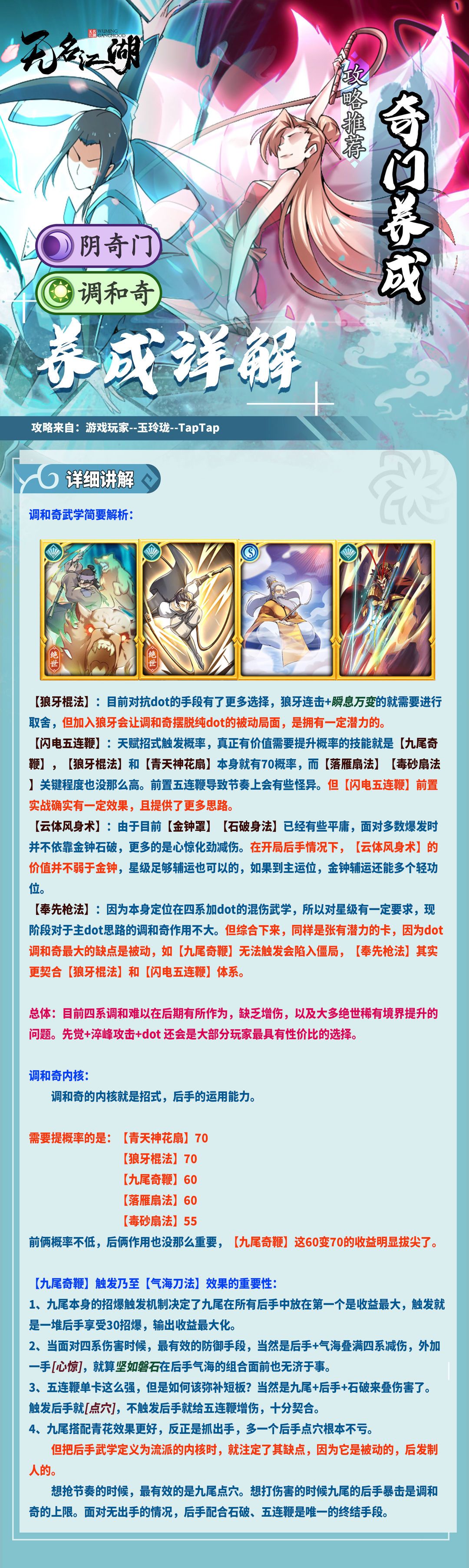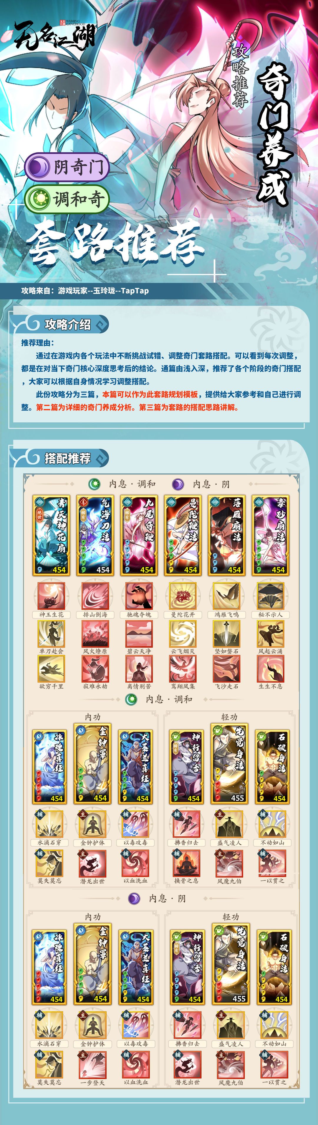 本篇攻略为大家整理了调和/阴奇套路推荐和奇门养成解析。本次根据原作者攻略内容分为三张长图,调和/阴奇套路推荐、奇门养成解析和多种套路推荐,朋友们根据需求查阅即可。武学理解可能存在偏差,欢迎指正和评论区提问。