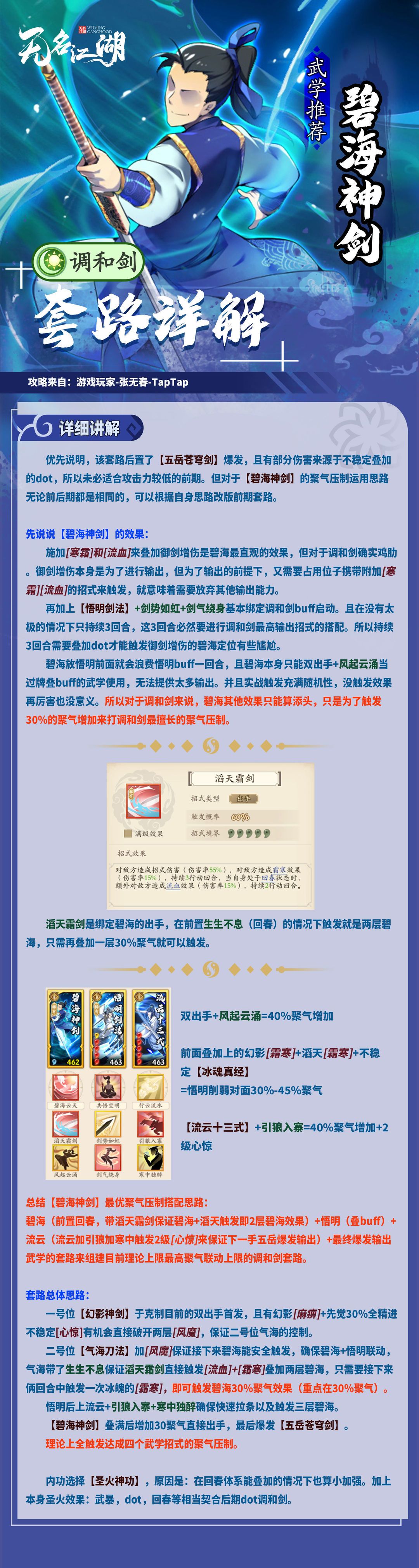 本篇攻略为大家整理了调和剑之【碧海神剑】聚气压制套路推荐。本次根据原作者攻略内容分为2张长图,调和剑套路推荐和套路搭配详解,朋友们根据需求查阅即可。武学理解可能存在偏差,欢迎指正和评论区提问。