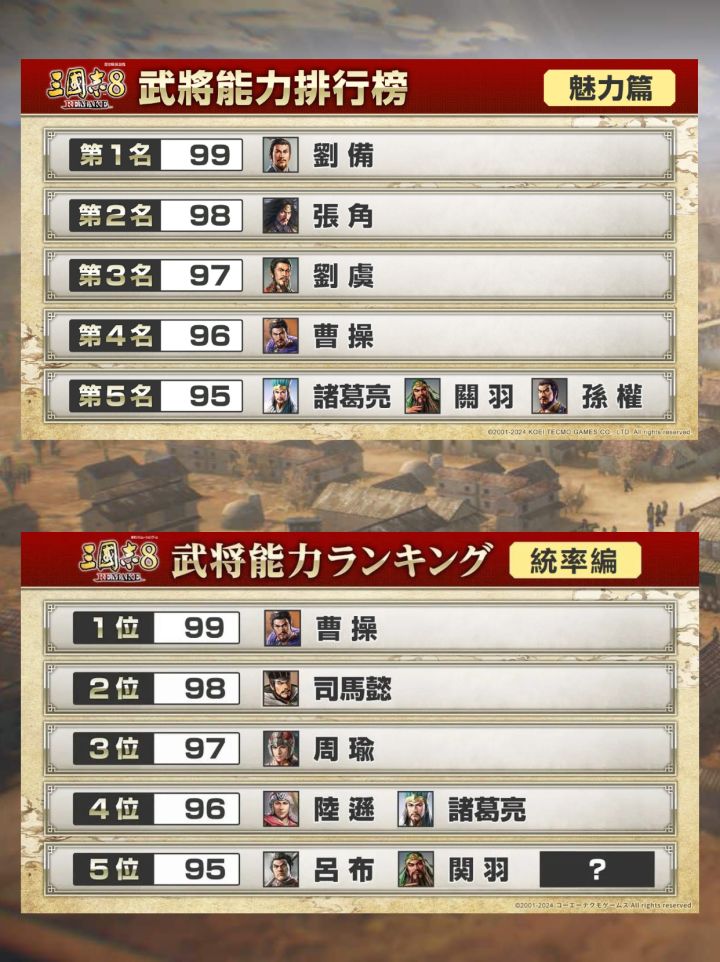 光荣特库摩公布了《三国志8重制版》的角色统率和魅力排行榜,让大家在选择武将时有更清晰的参考。