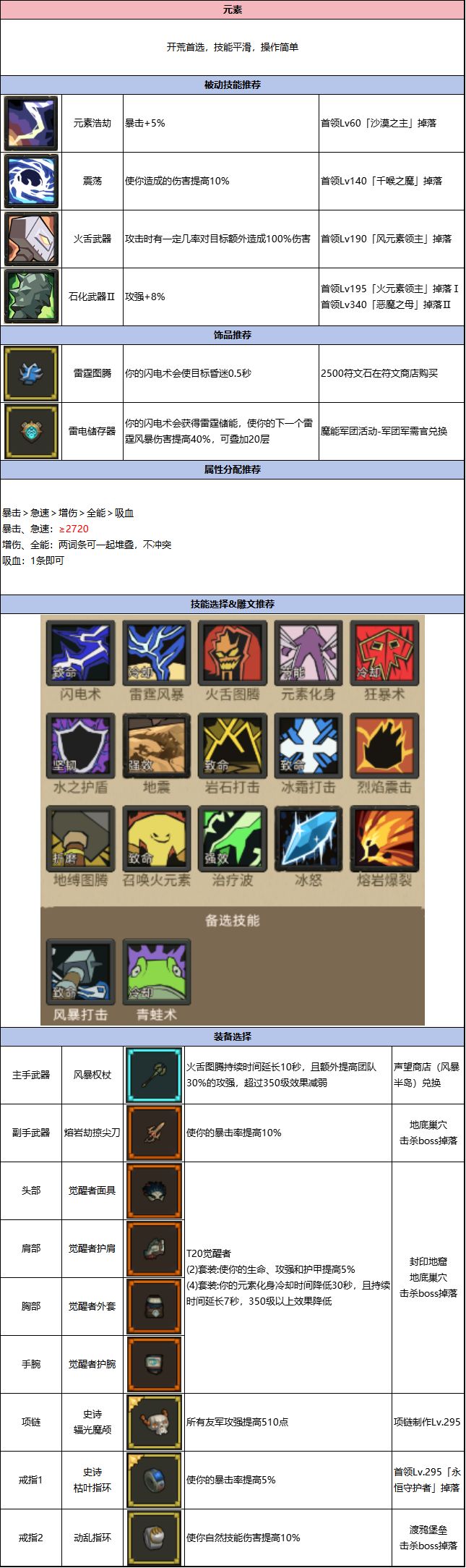 选择T20觉醒者四件套,配合专精被动闪电术暴击减少其他技能cd1秒以及“元素化身”节能雕文可使元素萨蓝耗无损,战斗阶段全程覆盖“元素化身”并拥有无视目标全额护甲值效果
