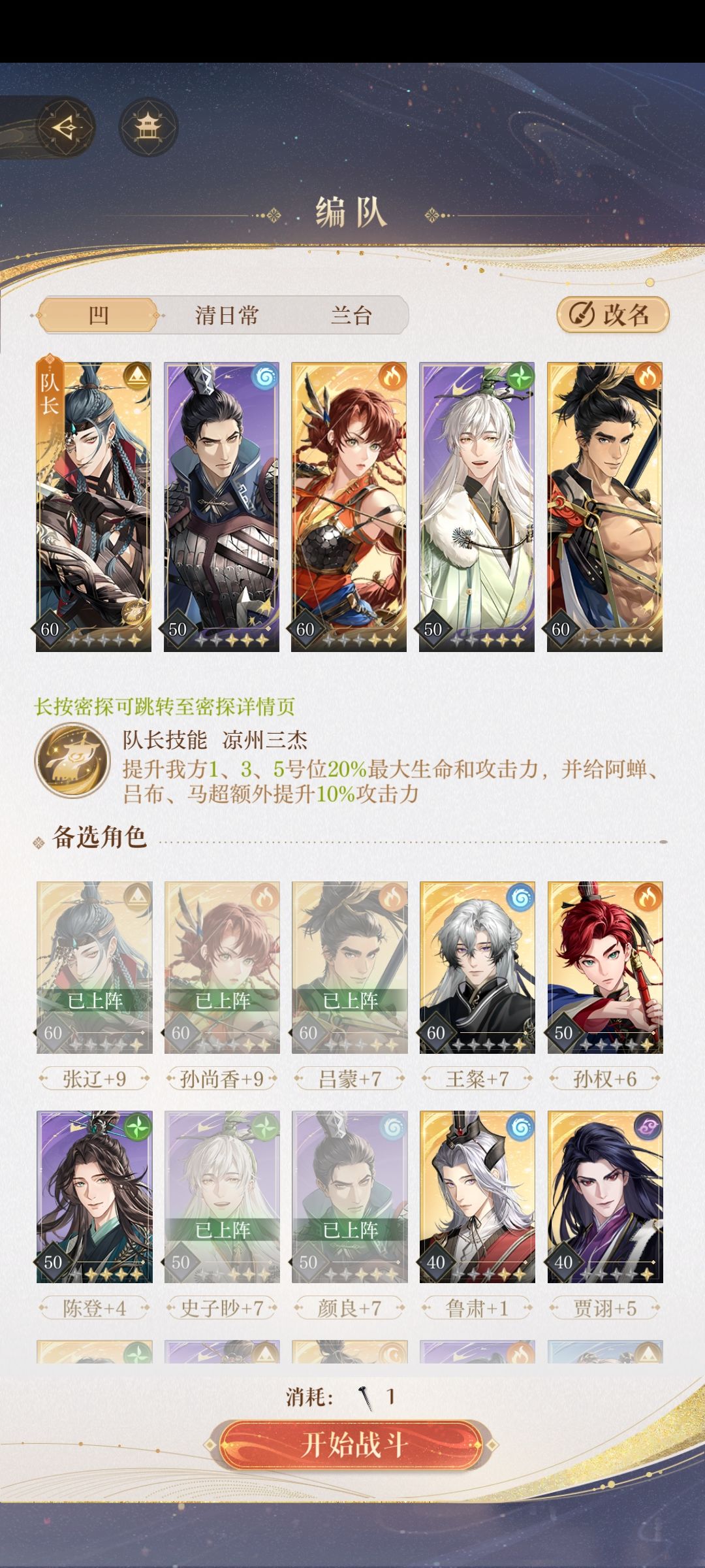 吕蒙攻击2605,二星,60+7,入场攻击3371,命盘一触即发和鼓舞(增加伤害点)。
