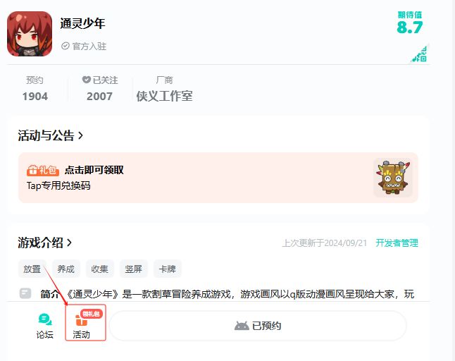 TapTap专属礼包——冒险家在下载游戏界面点击“礼包”,就可以看到来自通灵少年的专属礼包码!该处可领取礼包码*2(下方图文指示)