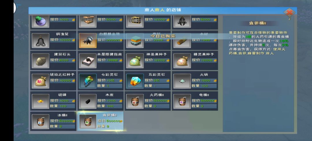 3级炸弹主要来源2-3天可以炸一轮老图守护怪,缺金币优先买冰腐,火硝→木炭炸弹制作材料看金币情况买。