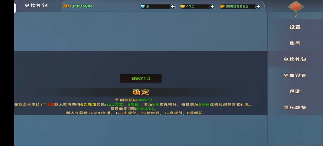 进游戏什么最优先当然是领礼包★温馨提示第一个码有等级限制只能3到7级使用 99310 update66 meetlove woxinren meethykb update80