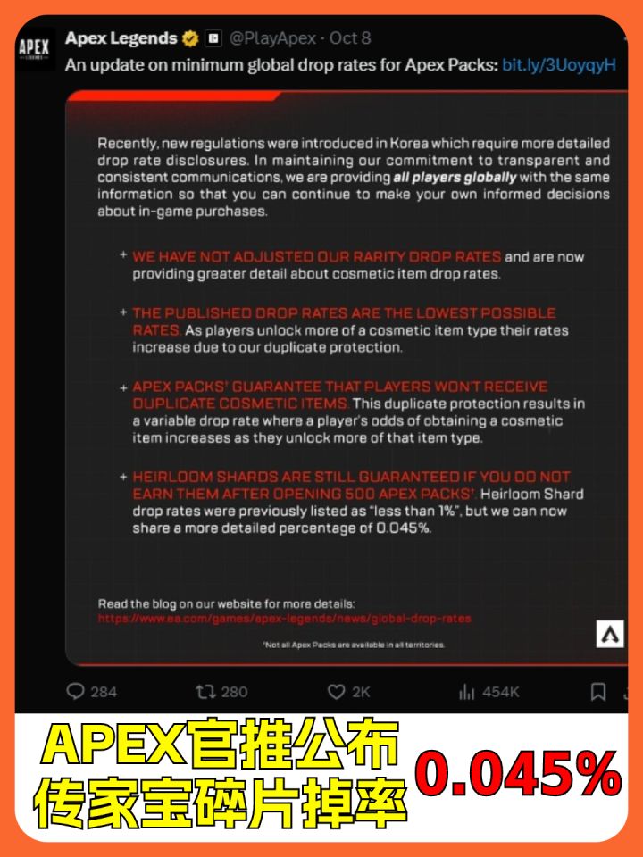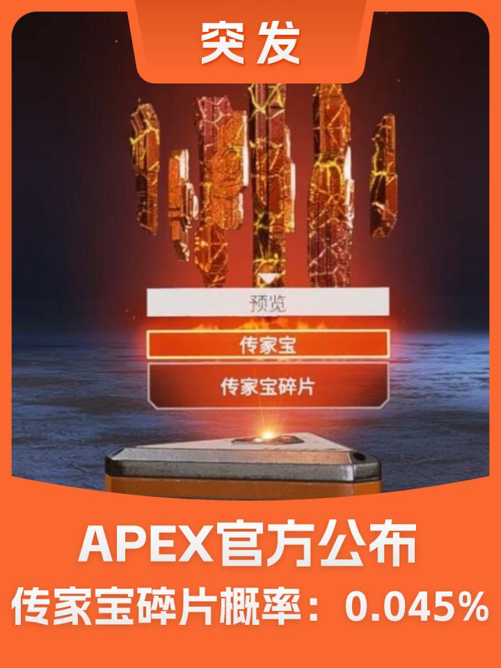 最近APEX官方公布了开箱掉落,大家最关心的肯定是传家宝碎片的掉落了。据EA公布的内容来看,传家宝碎片掉率“高达”——0.045%,也就比之前曾公开的碎片掉率不足1%低一点点,而且EA还为玩家们设立了保底机制:500个箱子必定会开出传家宝碎片; EA还有表示,《Apex》有开箱重复道具保护机制,玩家在获得其他物品时,没获得的新皮肤、传家宝碎片等掉率也会随之提高。