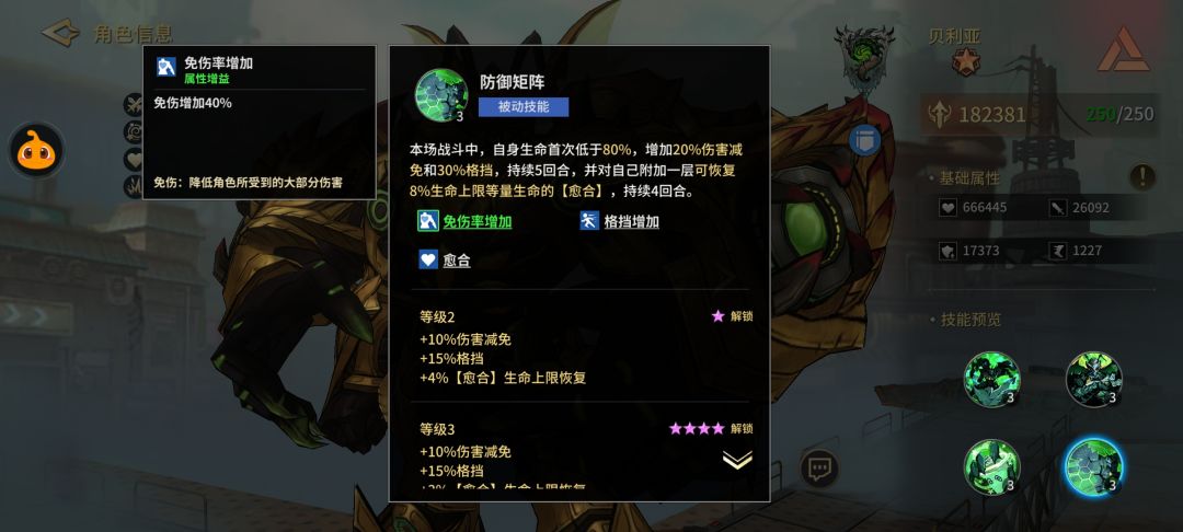 友方释放技能回复自身血量并50%概率眩晕一名对手。敌方释放技能对随机两名造成伤害并增加自身攻击。血量低于80%增加免伤和格挡,并回复一定血量,自身免疫眩晕。此被动也大大增加贝利亚战场的生存能力。