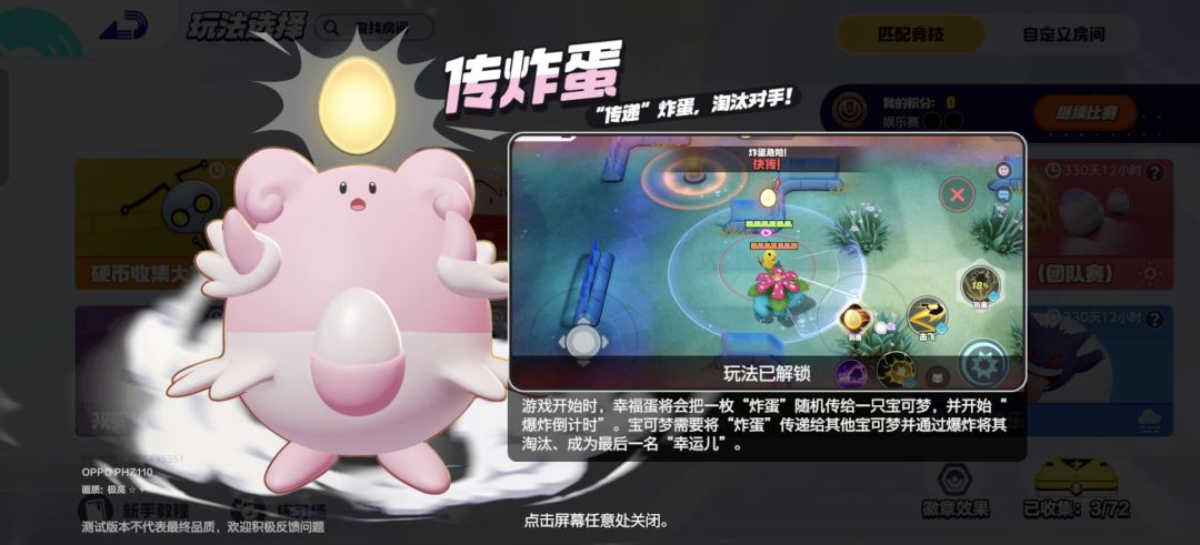 2.玩法简介:游戏开始时,幸福蛋将会把一枚“炸蛋”随机传给一只宝可梦,并开始“爆炸倒计时”。宝可梦需要将“炸蛋”传递给其他宝可梦并通过爆炸将其淘汰、成为最后一名“幸运儿”。