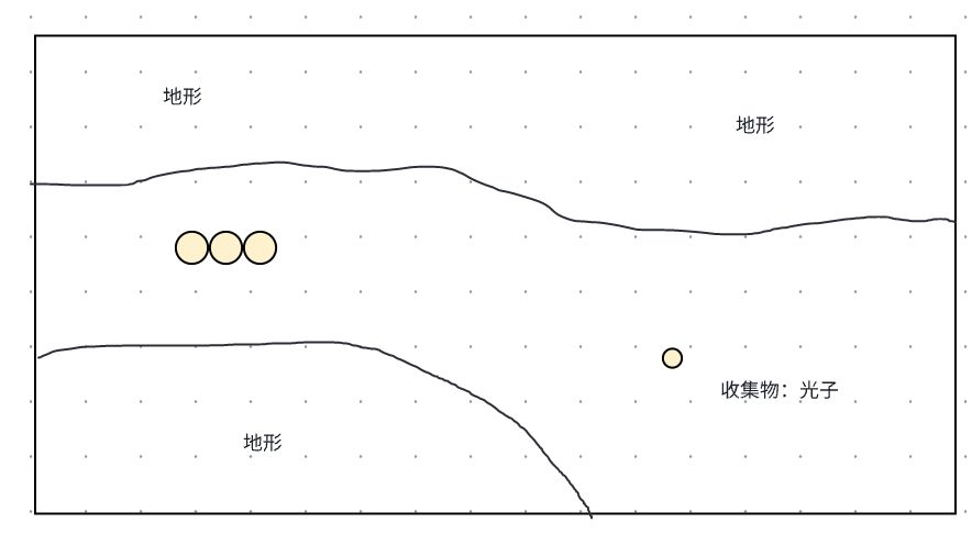 不过,最核心的是我们的地图场景中会有各种不同的地形,比如普通地形会让光子减速、反射地形会改变光子行动路径,折射地形则会同时改变光子的路径和速度,而黑洞作为伤害物,则会将光子强行吸收。