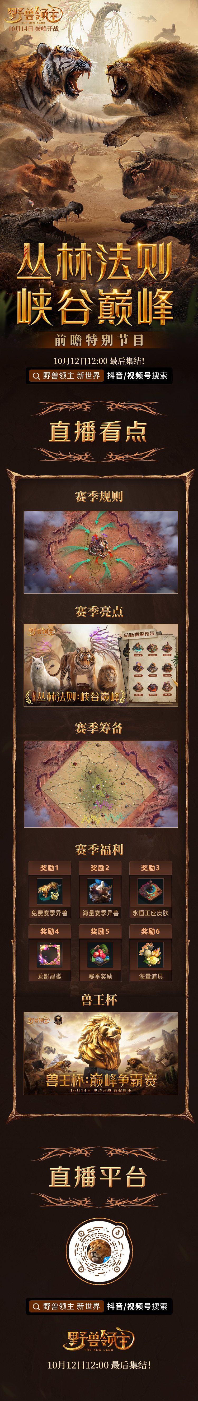 10月12日中午12点,《野兽领主:新世界》抖音/视频号官方直播间将开启赛季前瞻直播特别节目,为领主们介绍赛季规则、赛季亮点、赛季筹备、赛季福利、兽王杯等活动。领主记得锁定官方直播间哦!