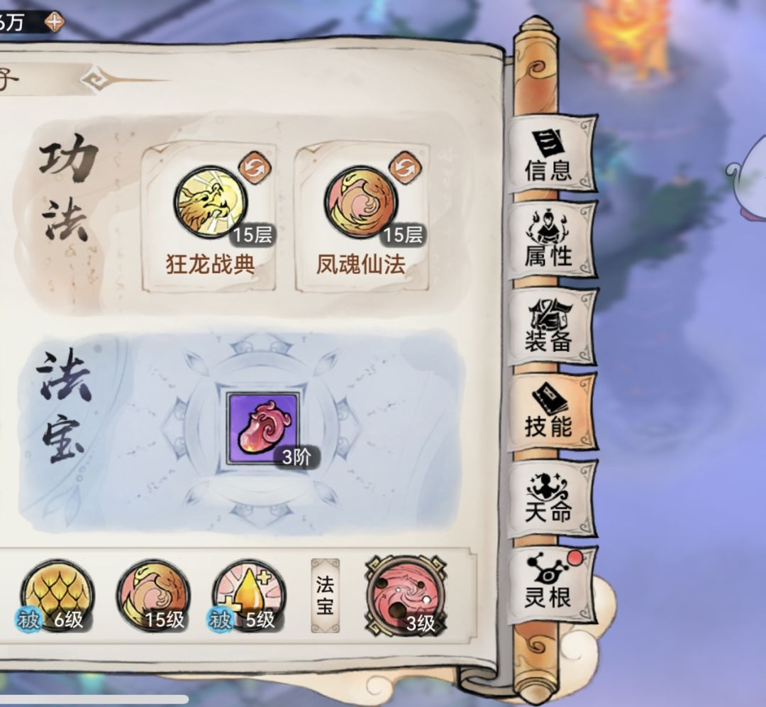 这里重点说一下云瑶,只能说选择云瑶是无奈之举,作为200天的老区玩家,一开始的攻略都让抽云瑶,当然云瑶也是比较养眼的,云瑶在我的队伍里其实有点不搭,我理想的是后续上美羊羊,作为老玩家我相信也有一部分道友拉了云瑶,这里分享一下我的养成思路。云瑶最被人诟病的就是暴毙,而我的阵容更偏向于铁桶(当然不是纯正的铁桶)所以我的云瑶带的是2云歌+2列阵,法宝炼化生命,阵图带双土,技能带狂龙+凤魂,带狂龙主要是为了它的被动效果提升坦度,凤魂也可以充当一个辅助复活位。